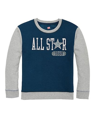 Ready, set, play! Cotton fleece sweatshirt provides comfort and warmth without the weight.Contrast sleeves for a stylish look.Available with center chest graphics.Ribbed hems at the neck, bottom and sleeves for added durability.All the comfort of Hanes with our famous tag-free neck label. Avoid the scratchy tag.Contrast stitching at the neck, bottom hem and cuffs.